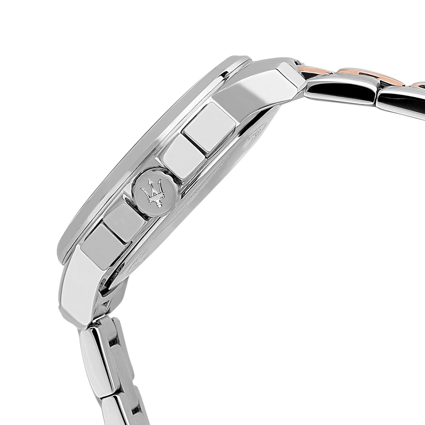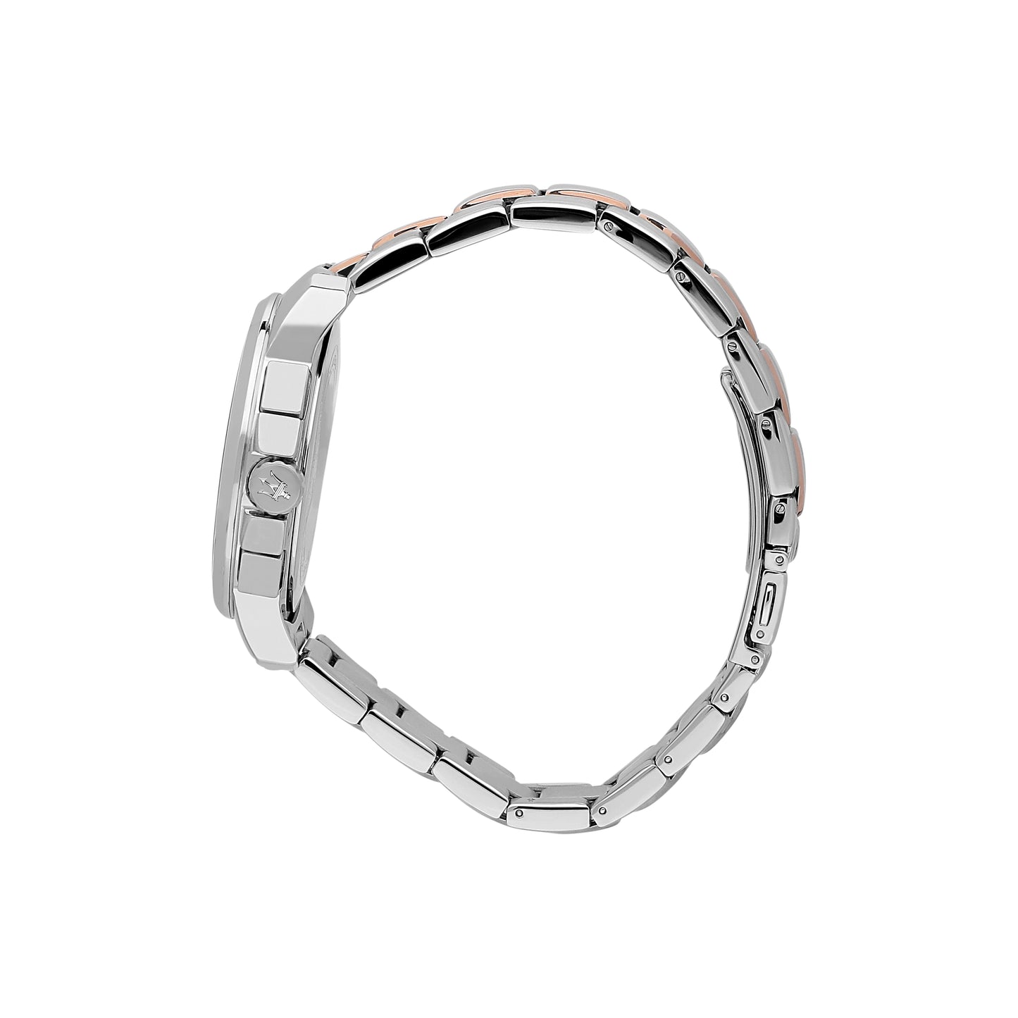 Orologio cronografo con cassa in acciaio della misura di 52x44mm con vetro minerale e quadrante di colore blu. Modello con cinturino in acciaio di colore acciaio, oro rosa e chiusura con chiusura subacquea con chiusura di sicurezza. La resistenza all'acqua di 5 atm.