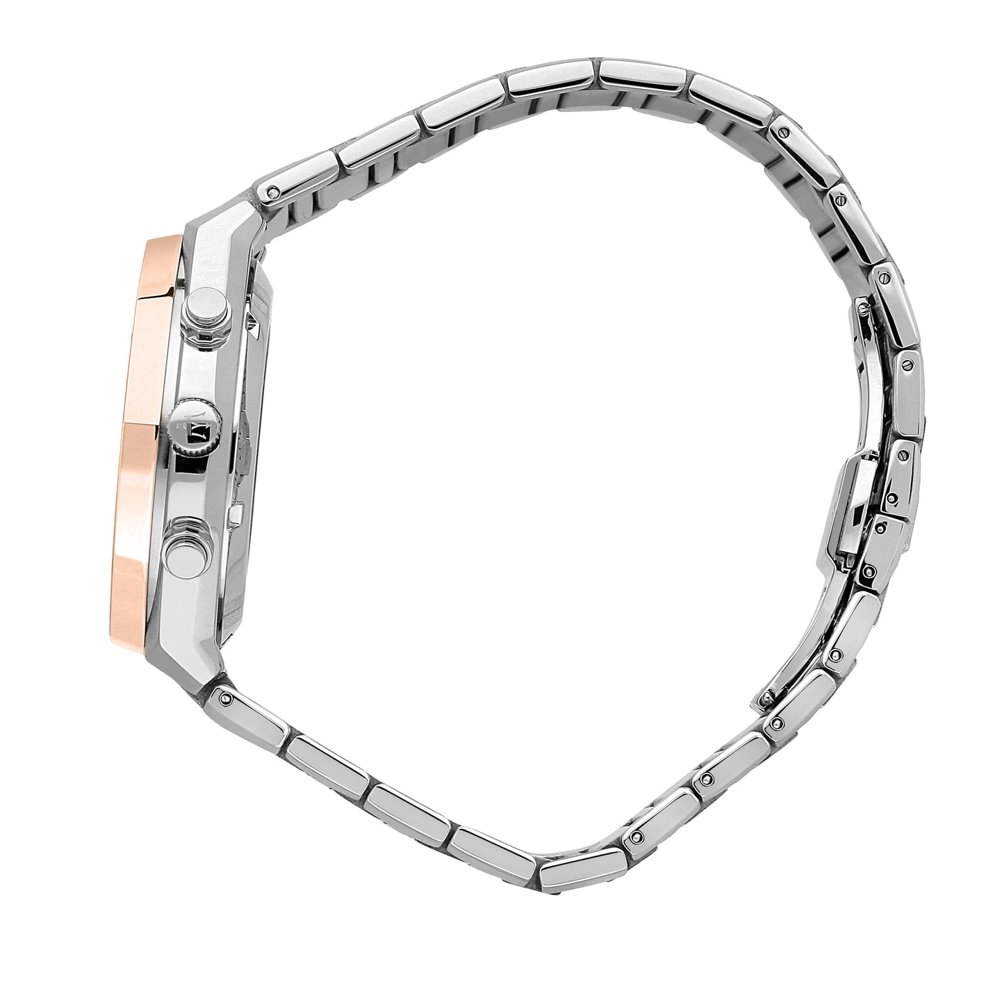 Orologio cronografo con quadrante di colore blu. La cassa è in acciaio spazzolato e raffinato di colore rosa da 45mm. Il cinturino è di colore acciaio, oro rosa. Orologio in metallo con chiusura doppia farfalla con pulsanti. La resistenza all'acqua è 10 atm