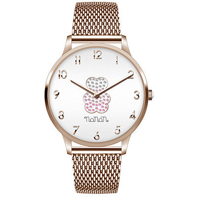 Orologio solo tempo da donna di Nanan della collezione orologi collezione. Orologio con cassa in acciaio del diametro: 33mm, di forma rotonda e colore oro rosa. Cinturino maglia milano di colore oro rosa e display analogico, con numeri rose gold. Resistenza all'acqua di 3atm e movimento al quarzo.