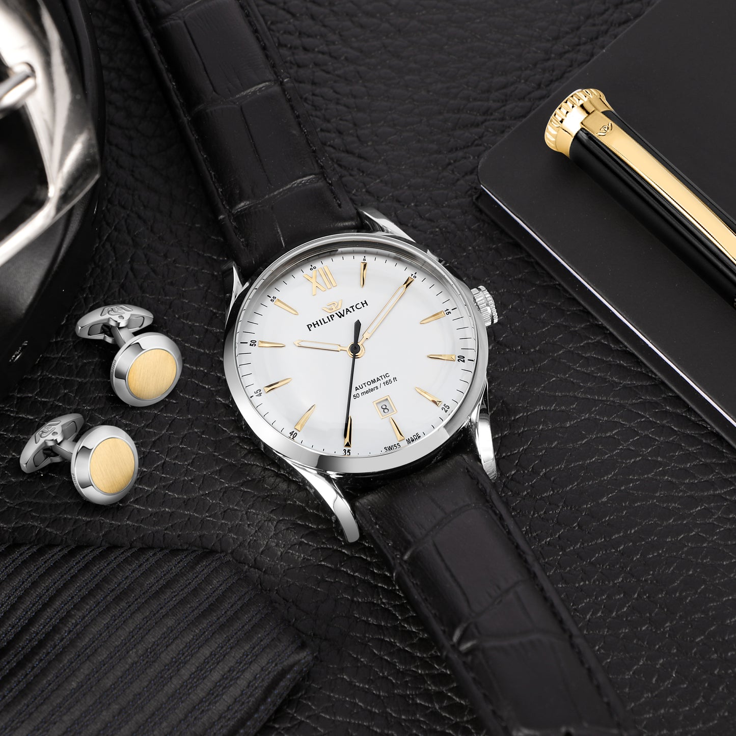 Tris: penna, gemelli e orologio.