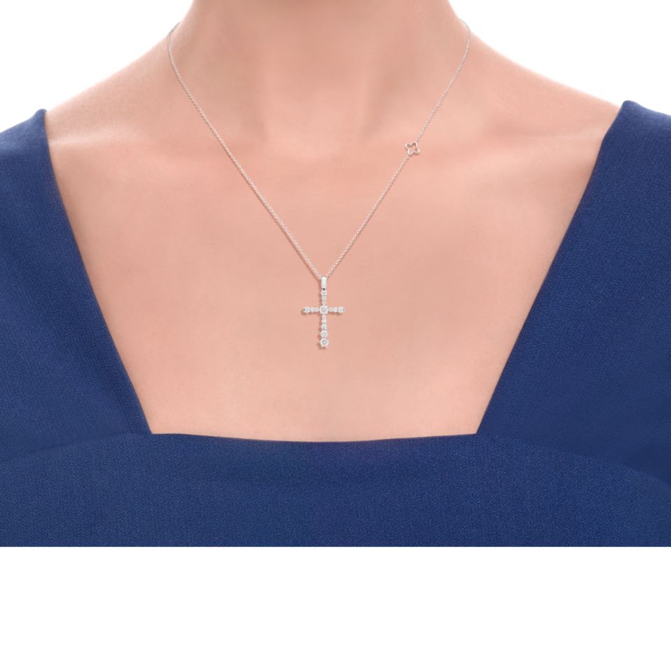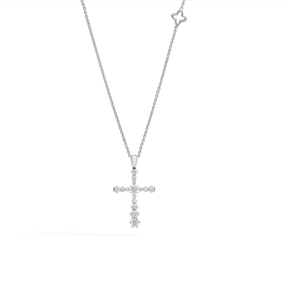 Collana con pendente a croce, griffe a sei punte in oro bianco 18 kt e diamanti taglio brillante (lunghezza 45 cm).