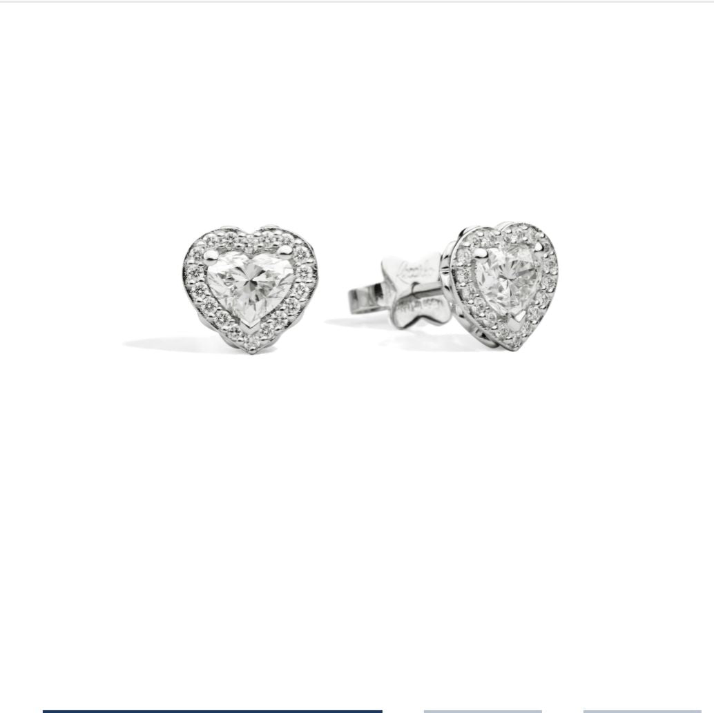 Orecchini in oro bianco 18 kt con diamanti centrali forma a cuore contornati da diamanti forma rotonda.