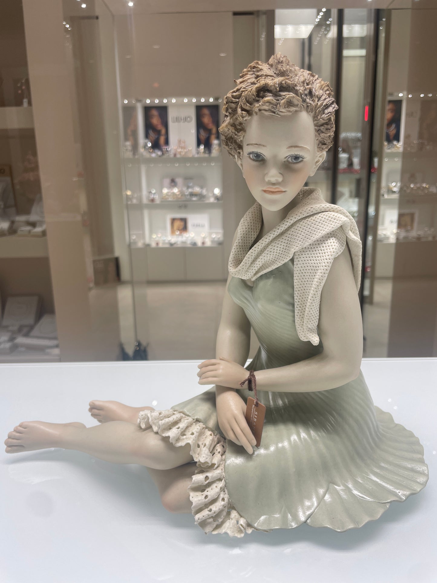 Figura in porcellana raffigurante una donna in un elegante abito plissettato, con sottogonna di pizzo e una morbida sciarpa in tulle bianco. Porta i capelli molto corti arruffati su un lato, mentre siede con le gambe di lato e poggia le mani una sull'altra sulle gambe.
