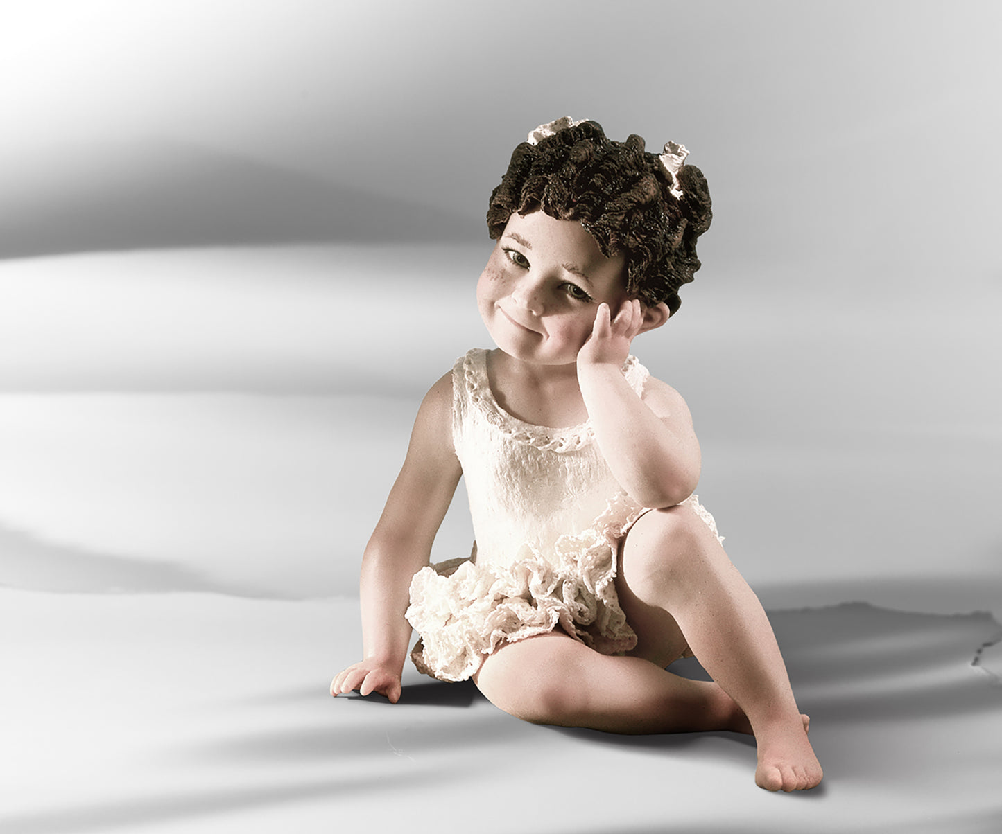 Figura in porcellana raffigurante una bimba in un delicato tutù da ballerina in pizzo. Siede a terra con un gomito appoggiato al ginocchio e la mano alla guancia; porta i capelli acconciati in due chignon alti e laterali, con due fiocchetti in pizzo bianco, e sorride divertita nel guardare le sue piccole compagne provare il nuovo balletto.