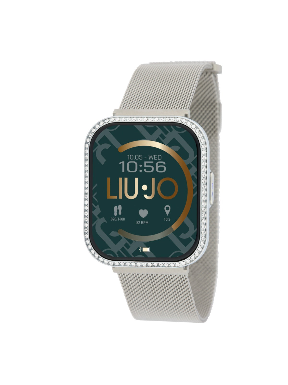 Smartwatch di Liujo Voice Slim Luxury Silver. Cassa squadrata in acciaio dalle dimensioni di 36 mm x 44 mm. Lunetta con cristalli bianchi. Quadrante con display AMOLED da 1,2'' completamente touch. Cinturino in maglia Milano d'acciaio anallergico; chiusura magnetica. Classificazione d'impermeabilità IP68. Funzioni di pedometro, cardiofrequenzimetro al fondello con monitoraggio del battito. Calcolo delle calorie bruciate e della distanza percorsa, monitoraggio del sonno e sedentary reminder. Integrato inoltre cronometro e timer.